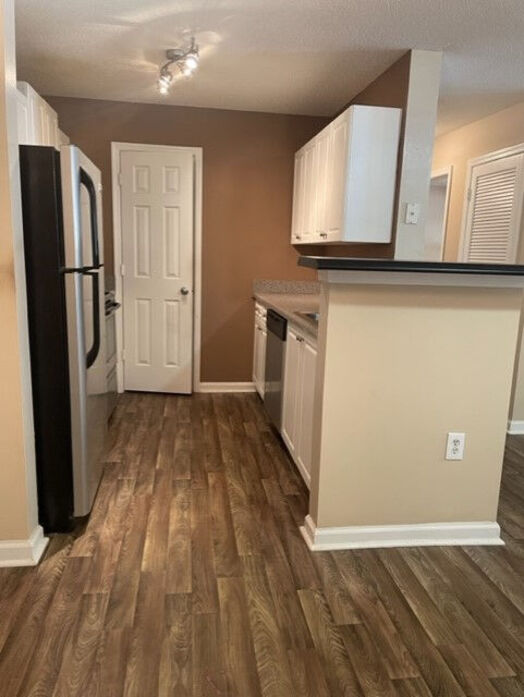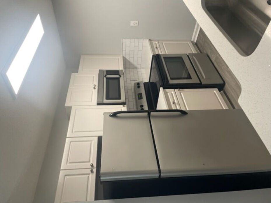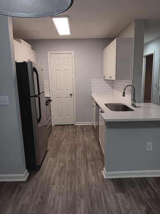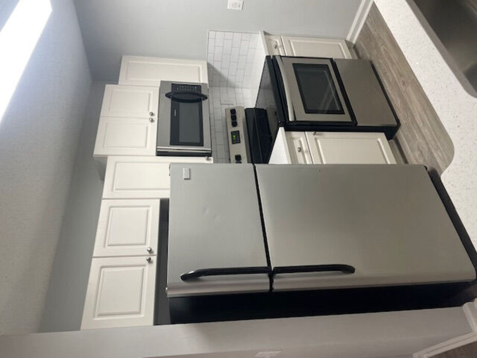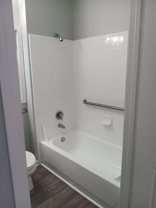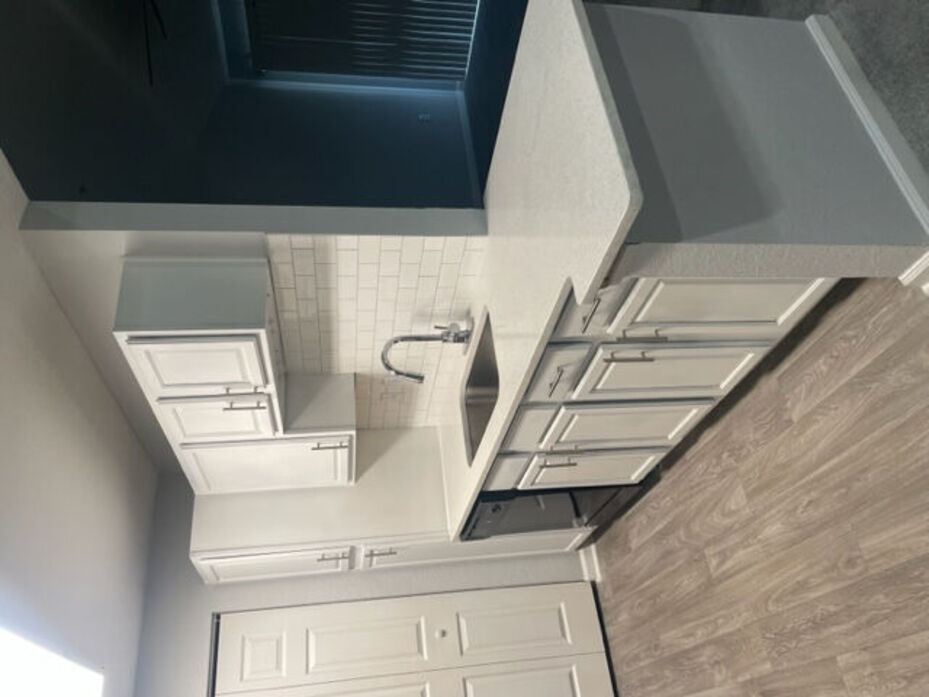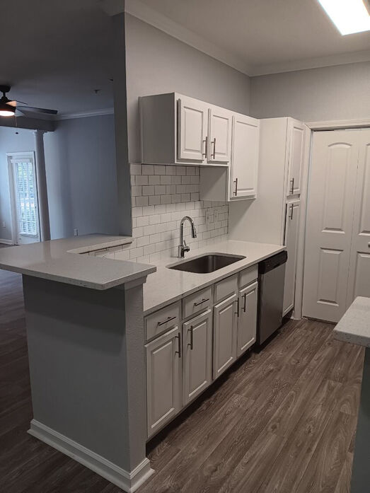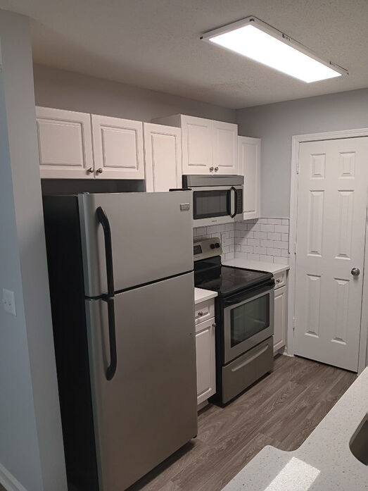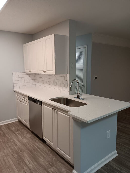 The Asherville floor plan offers a well‑designed 1 bedroom, 1 bathroom layout with 760 square feet of comfortable living space. This home features an open‑concept living and dining area with wood‑style flooring, modern lighting, and a ceiling fan that adds both style and comfort. Large windows and a private patio or balcony fill the space with natural light and extend the living area outdoors. The kitchen is thoughtfully updated with white cabinetry, quartz‑style countertops, a classic subway‑tile backsplash, and stainless‑steel appliances, complemented by a breakfast bar that opens to the main living space. The bedroom provides a quiet retreat with plush carpeting, ample closet space, and a ceiling fan for added comfort. The bathroom showcases clean, contemporary finishes including a full tub/shower combination with tiled surround and a modern vanity with generous storage. A dedicated laundry area with washer and dryer completes this functional and inviting apartment home. The photos represent both renovated and non-renovated homes in this floor plan group. For specific detail on your next home, contact the leasing office today!