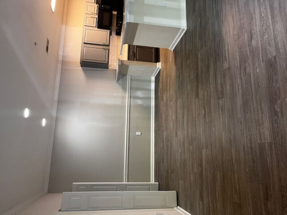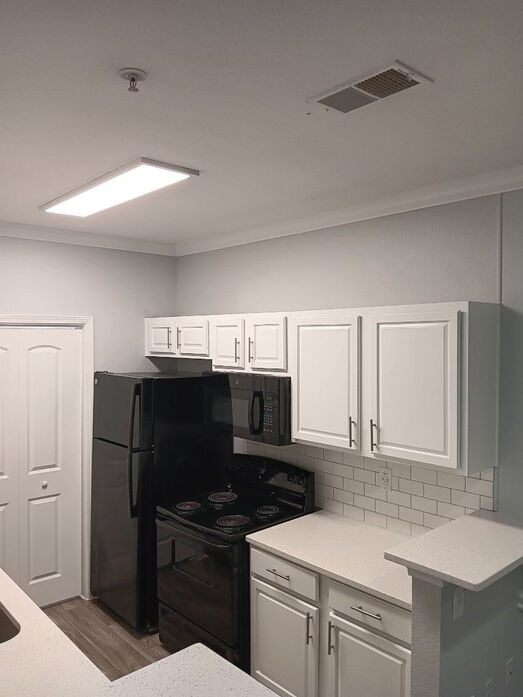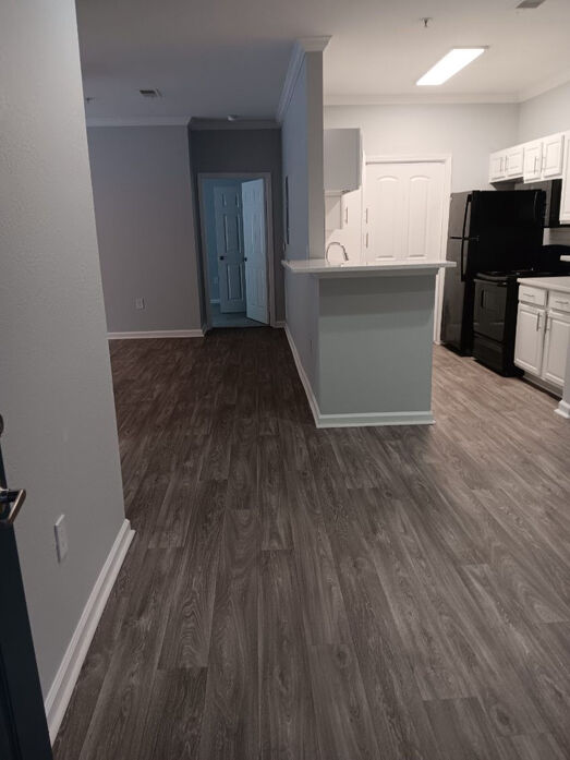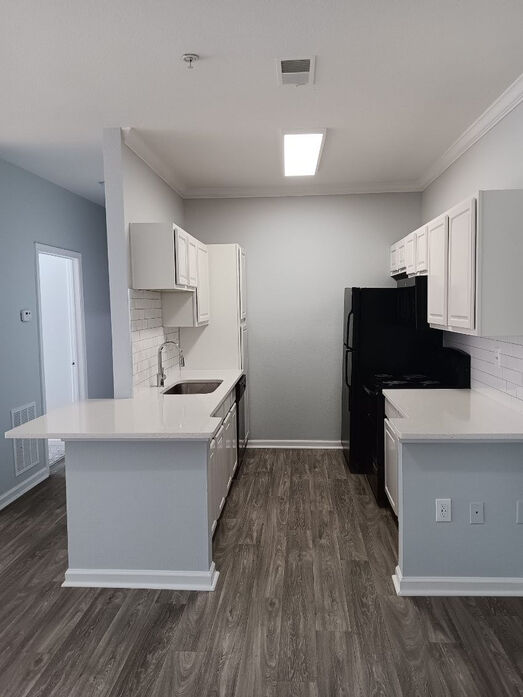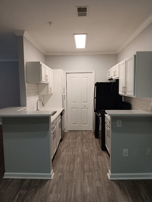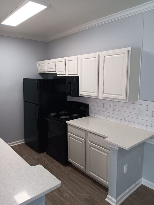 The Magnolia floor plan offers a spacious and thoughtfully designed 1 bedroom, 1 bathroom layout with 875 square feet of comfortable living space. This home features an open living and dining area with wood‑style flooring, crown molding, and modern lighting, creating a bright and inviting atmosphere. The expansive layout provides flexibility for entertaining, working from home, or simply relaxing, with natural light flowing throughout the space. A private patio or balcony extends the living area and offers a peaceful outdoor retreat. The kitchen is generously sized and beautifully updated with white cabinetry, quartz‑style countertops, a classic subway‑tile backsplash, and black appliances. A large breakfast bar opens to the main living space, making the kitchen both functional and social. The bedroom serves as a comfortable retreat with plush carpeting, a ceiling fan, and ample space for a full bedroom setup. The bathroom features clean, contemporary finishes including a full tub/shower combination and an oversized double‑sink vanity with abundant storage. With its larger footprint and well‑defined spaces, the Magnolia floor plan delivers both comfort and style in a truly livable one‑bedroom home.